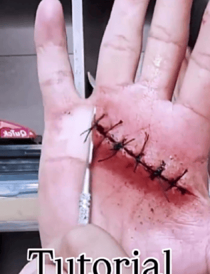 No vídeo, o homem aparece criando o que parece ser uma ferida costurada na palma da mão.